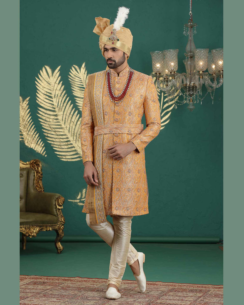 Meticulously designed for the modern groom, this Yellow & Golden pure banarasi jacquard Sherwani Set exemplifies timeless elegance and refined craftsmanship. The luxurious banarasi jacquard fabric drapes beautifully, while the structured standing collar commands attention with understated sophistication. Intricate thread, beads and sequin embellishments grace the top, creating visual depth without overwhelming the silhouette. Hand-detailed embroidery adorns the collar and buttons, offering a personalized touch that speaks to quality. Paired with the cordinating golden dupion art silk bottom and golden dupatta with embroidery on borderline this ensemble delivers a cohesive, polished look. Ideal for weddings, engagements, and cherished celebrations where authentic style and heritage craftsmanship converge.