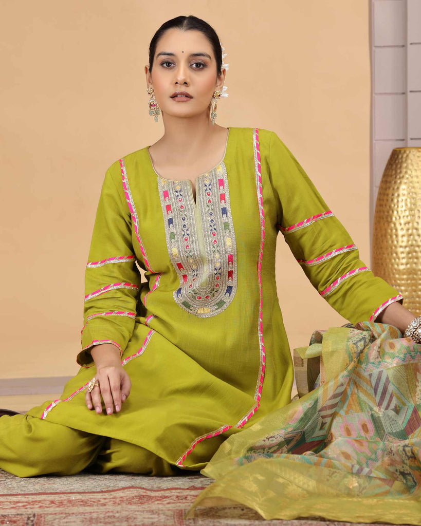 This meticulously crafted green chiffon ensemble represents a masterclass in traditional Indian tailoring executed in ready-to-wear form. The A-line style kameez features comprehensive gota patti and lace work on front and sleeve terminations, with zari and thread embroidery framing the neckline—a technique that creates dimensional luminosity while maintaining structural integrity. The coordinated pant silhouette provides contemporary balance to the ornate upper piece, while the chanderi jacquard dupatta introduces textural sophistication through its printed motif. Engineered for immediate wear at weddings, festive celebrations, and formal occasions, this three-piece collection synthesizes heritage embellishment methodologies with modern construction standards, delivering authentic ethnic refinement for discerning patrons who prioritize quality and design coherence.