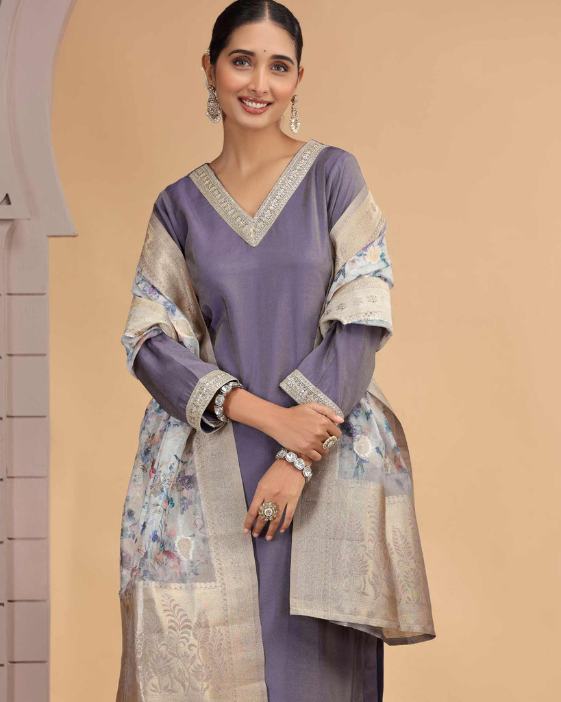 Purple Readymade Chiffon Salwar Suit For Woman With Chanderi Jacquard Dupatta