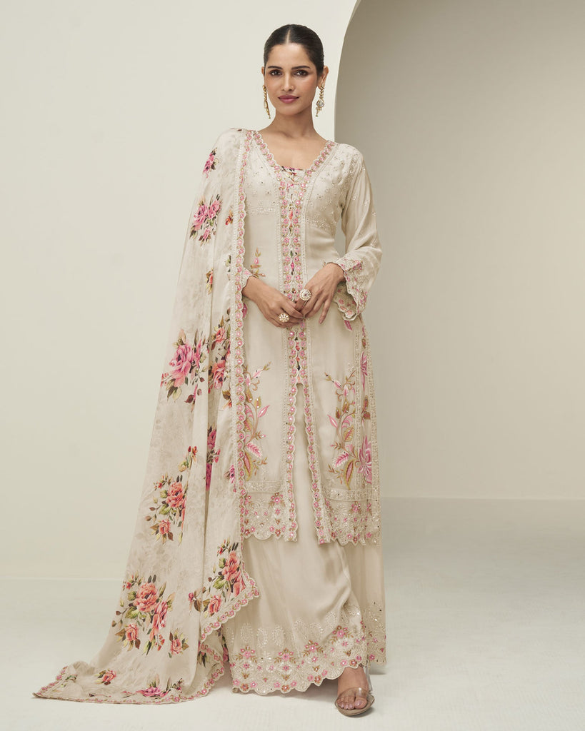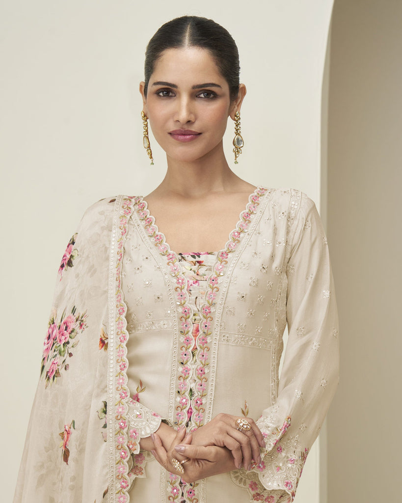 Experience understated luxury with this beige chinnon silk palazzo suit, where traditional embroidery meets contemporary design. The kameez features radiant thread, sequins and mirror work across the front, creating an elegant focal point that captures light beautifully. Matching palazzo trousers showcase detailed embellishment along the hem, maintaining visual balance throughout the silhouette. The accompanying floral print chinnon silk dupatta with embroidered borderline adds versatility and grace to your ensemble. Designed for immediate wear, this three-piece collection seamlessly transitions from festive celebrations to wedding festivities, offering the sophistication of heritage craftsmanship without the wait of custom tailoring.