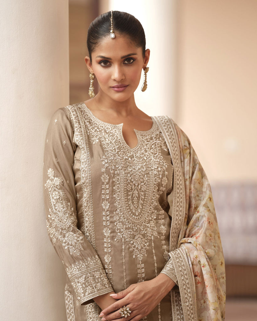 This Beige Simar silk palazzo suit exemplifies refined craftsmanship and traditional artistry in a ready-to-wear format. The kameez front features comprehensive zari sequins embroidery, creating a luminous, statement-making aesthetic. introducing movement and authentic ethnic detailing. The chinnon silk palazzo bottom incorporates floral print all over and zari work at the ghera, ensuring design harmony across the complete ensemble. The matching print of palazzo with intricately embroidery on borders on chinnon dupatta provides the finishing touch, coordinating seamlessly with all components. This three-piece collection offers immediate wearability for festive occasions, weddings, and celebrations, combining heritage embellishment techniques with contemporary silhouettes—ideal for those seeking authentic ethnic elegance without customization timelines.