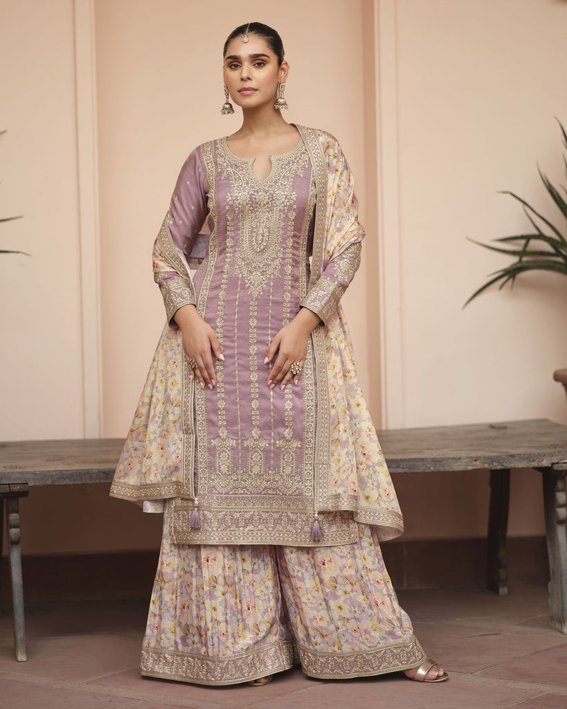 This Lavender Simar silk palazzo suit exemplifies refined craftsmanship and traditional artistry in a ready-to-wear format. The kameez front features comprehensive zari sequins embroidery, creating a luminous, statement-making aesthetic. introducing movement and authentic ethnic detailing. The chinnon silk palazzo bottom incorporates floral print all over and zari work at the ghera, ensuring design harmony across the complete ensemble. The matching print of palazzo with intricately embroidery on borders on chinnon dupatta provides the finishing touch, coordinating seamlessly with all components. This three-piece collection offers immediate wearability for festive occasions, weddings, and celebrations, combining heritage embellishment techniques with contemporary silhouettes—ideal for those seeking authentic ethnic elegance without customization timelines.