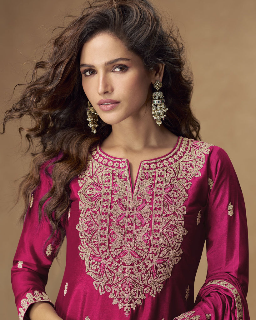 This Magenta chinnon silk palazzo suit exemplifies refined craftsmanship and traditional artistry in a ready-to-wear format. The kameez front features comprehensive zari embroidery, creating a luminous, statement-making aesthetic. introducing movement and authentic ethnic detailing. The matching chinnon silk palazzo bottom incorporates dense work on the ghera, ensuring design harmony across the complete ensemble. The intricately embroidered chinnon silk dupatta provides the finishing touch, coordinating seamlessly with all components. This three-piece collection offers immediate wearability for festive occasions, weddings, and celebrations, combining heritage embellishment techniques with contemporary silhouettes—ideal for those seeking authentic ethnic elegance without customization timelines.
