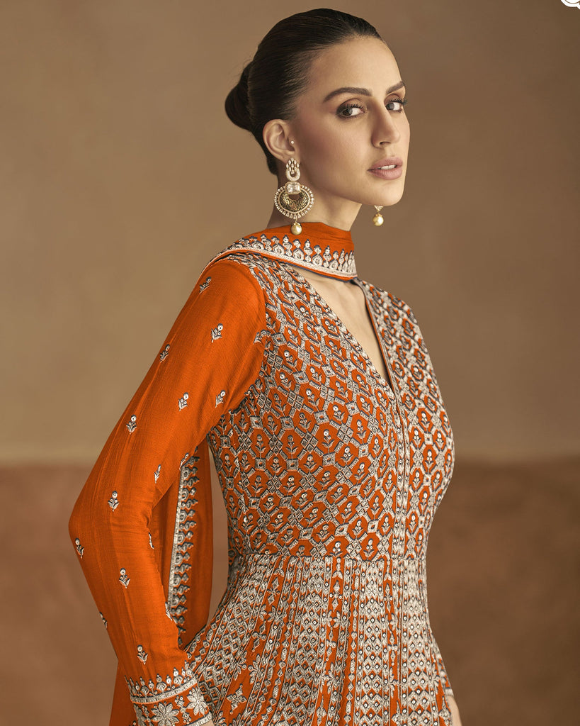 Orange Chinnon Silk Women Readymade Anarkali Gown With Dupatta
