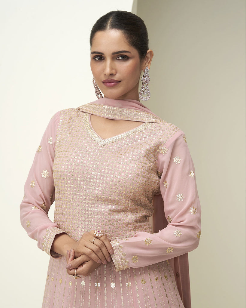 This Pink pure georgette anarkali floor length gown showcases expert craftsmanship with sequins embroidery and authentic zari work. The pure georgette gown features elegant work of zari thread detailing with sequins work on front and back, perfectly complemented by georgette dupatta with embroidery all over and on borderline. The beautiful dress offering a harmonious and refined look ideal for festive and formal occasions.