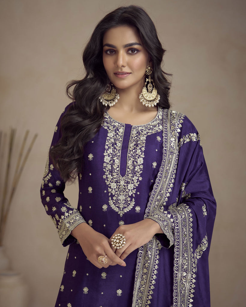 This Purple Chinnon silk palazzo suit exemplifies refined craftsmanship and traditional artistry in a ready-to-wear format. The kameez front features comprehensive thread and sequins embroidery, creating a luminous, statement-making aesthetic. introducing movement and authentic ethnic detailing. The chinnon silk palazzo bottom incorporates same embroidery all over and at the ghera, ensuring design harmony across the complete ensemble. The matching chinnon dupatta with work all over provides the finishing touch, coordinating seamlessly with all components. This three-piece collection offers immediate wearability for festive occasions, weddings, and celebrations, combining heritage embellishment techniques with contemporary silhouettes—ideal for those seeking authentic ethnic elegance without customization timelines.