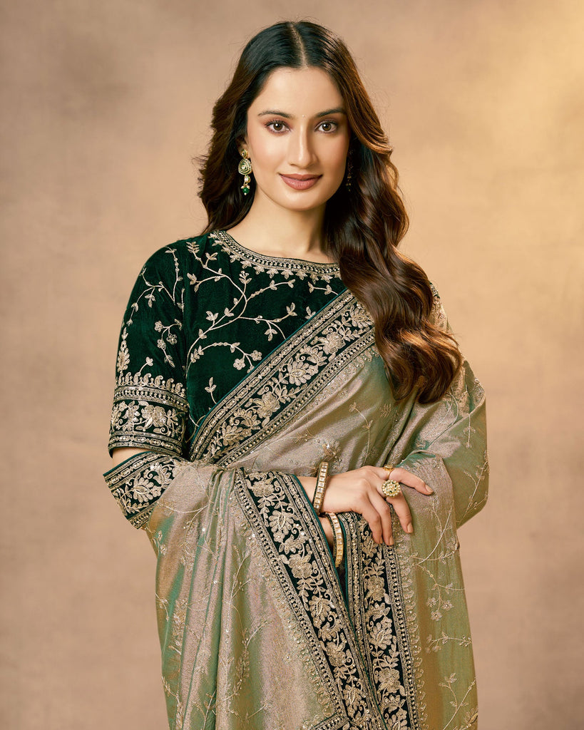 Green Saree In Tissue Kora Silk For Women With Velvet Blouse