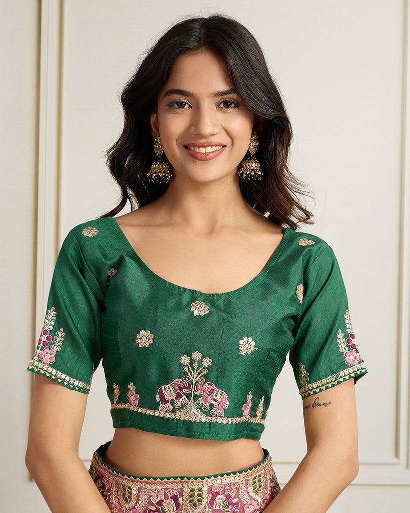 Pink Georgette Saree With Embroidered Art Silk Green Blouse For Women