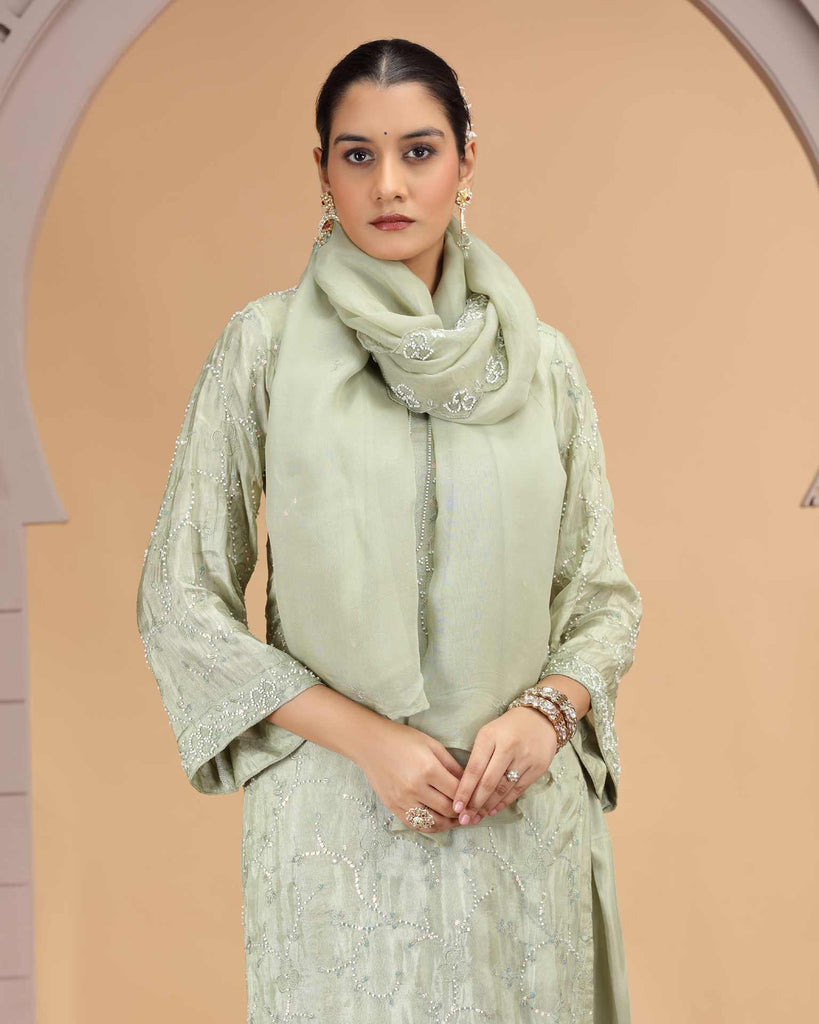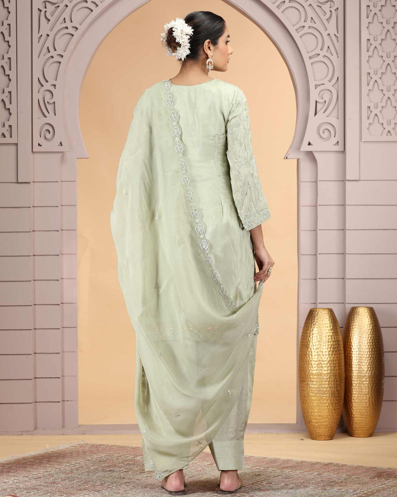 This Green color satain silk farsi pant suit exemplifies refined craftsmanship and traditional artistry in a ready-to-wear format. The straight style kameez features comprehensive thread work embroidery all over with beads work, creating a luminous, statement-making aesthetic. introducing movement and authentic ethnic detailing. The matching farsi pant style bottom, and a pure chiffon dupatta with work ensuring design harmony across the complete ensemble. This three-piece collection offers immediate wearability for festive occasions, weddings, and celebrations, combining heritage embellishment techniques with contemporary silhouettes ideal for those seeking authentic ethnic elegance without customization timelines.