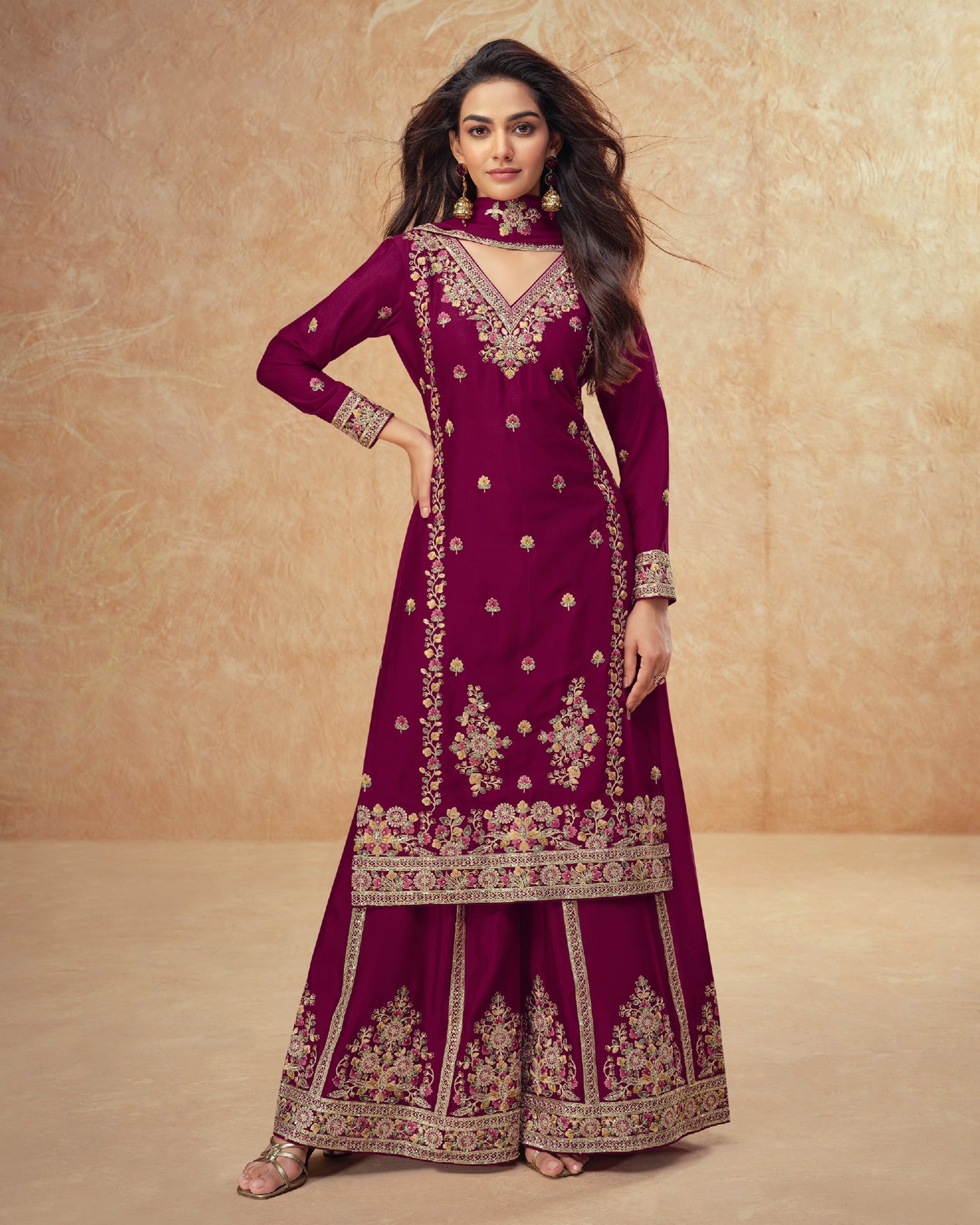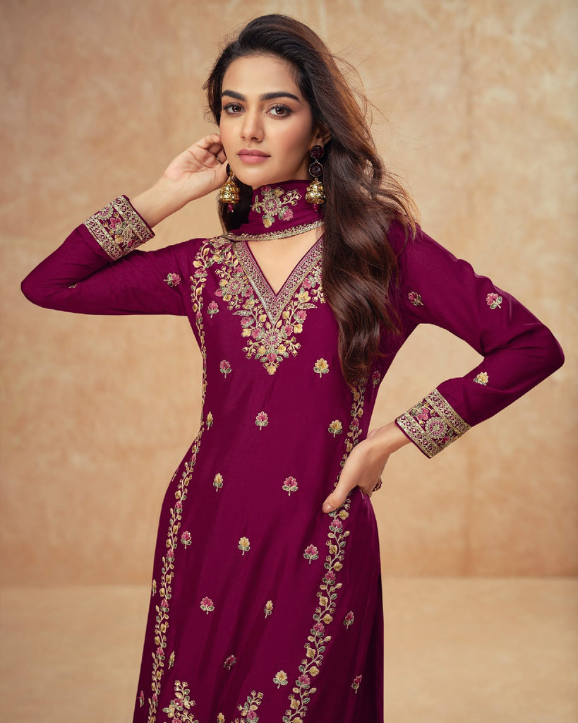 Wine Chinnon Silk Thread Sequins Work Women Readymade Palazzo Suit