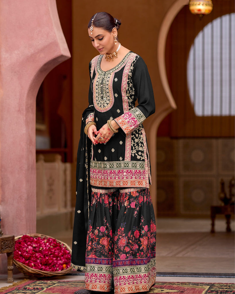 Black Chinnon Silk Zari Sequins Mirror Work Women Readymade Sharara Suit