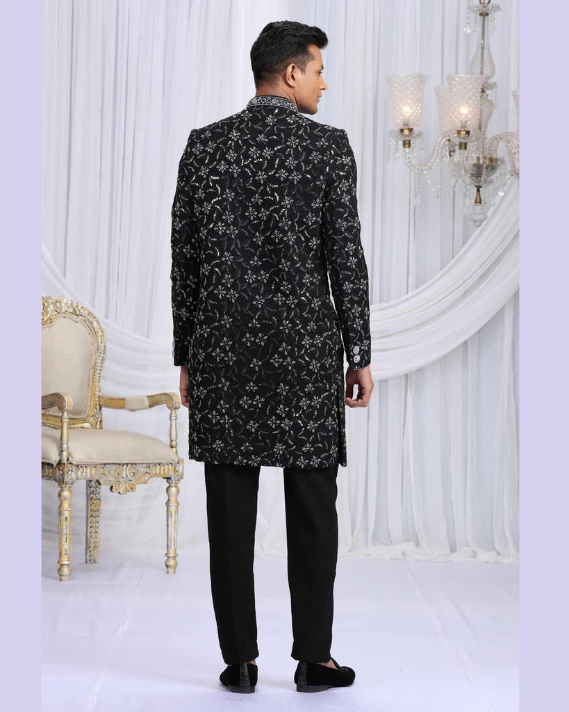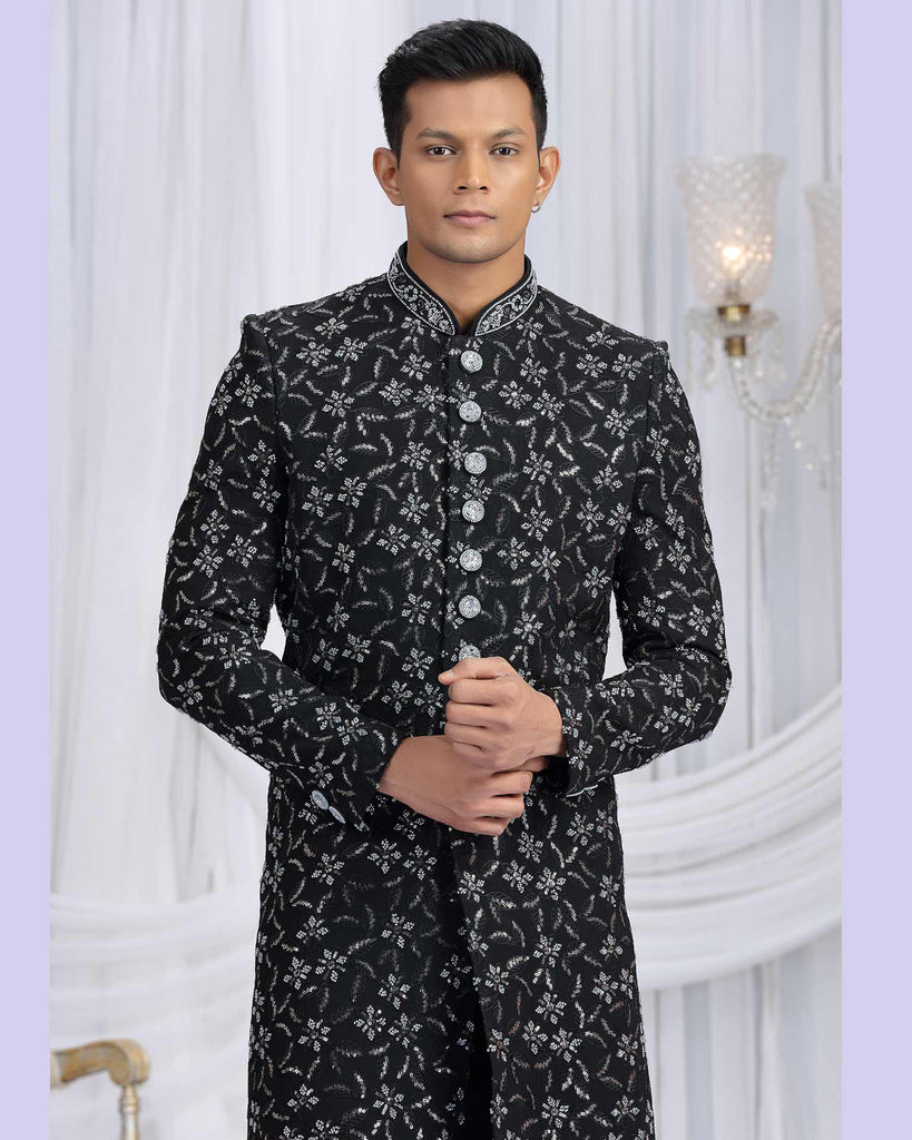 Meticulously designed for the modern groom, this Black Art Silk Sherwani Set exemplifies timeless elegance and refined craftsmanship. The luxurious art silk fabric drapes beautifully, while the structured standing collar commands attention with understated sophistication. Intricate thread, beads and sequin embellishments grace the top, creating visual depth without overwhelming the silhouette. Hand-detailed embroidery adorns the collar and buttons, offering a personalized touch that speaks to quality. Paired with the coordinating art silk bottom, this ensemble delivers a cohesive, polished look. Ideal for weddings, engagements, and cherished celebrations where authentic style and heritage craftsmanship converge.