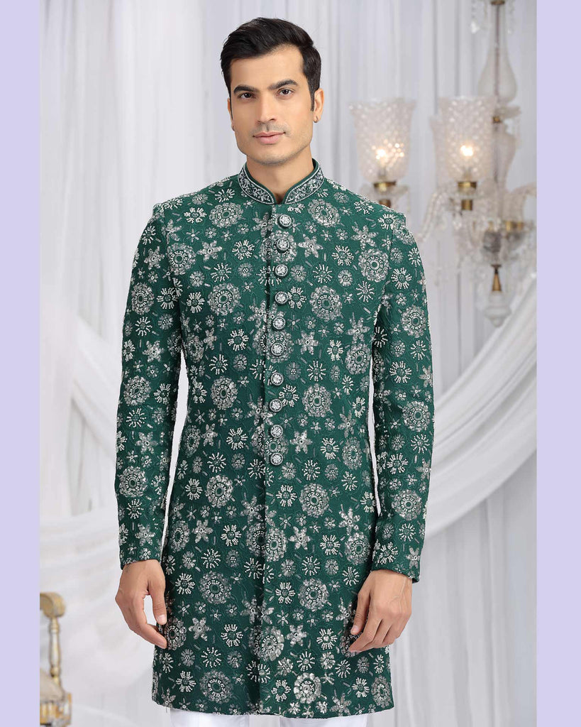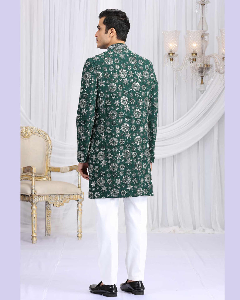 Green & Off White Art Silk Groom Sherwani Set For Men