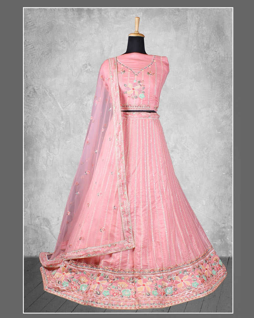Pink Net Sequins & Thread Work Customized Women Lehenga Choli With Net Dupatta