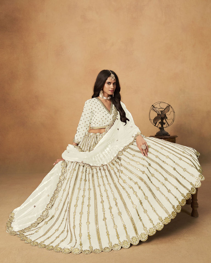 This stunning White color Art Silk Embroidered Lehenga Choli is perfect for any special occasion. Crafted from White color with Art Silk fabric, the lehenga is finished with intricate gota patti work embroidery spread all over the front and back of the lehenga. The set is completed with a matching blouse also in same fabric of lehenga with heavy embroidery and net dupatta with embroidery work all over and dense work on borderline.