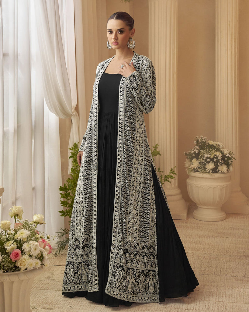 Black Chinnon Women Silk Readymade Anarkali Gown With Embroidered Jacket