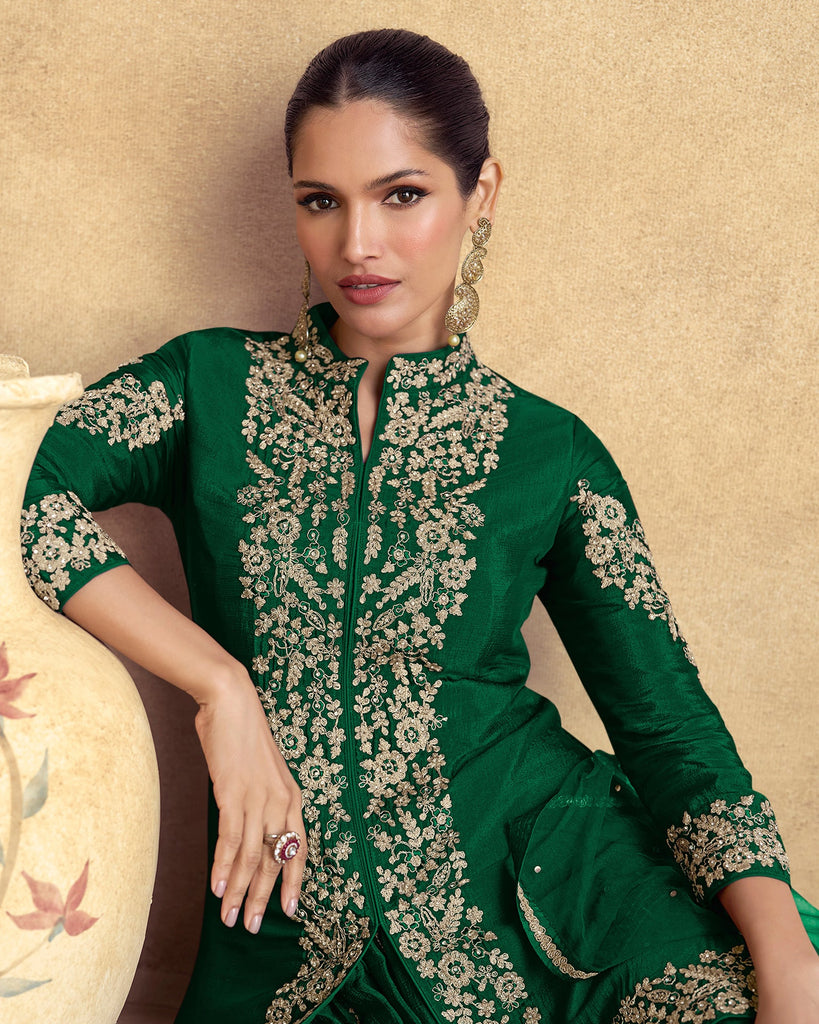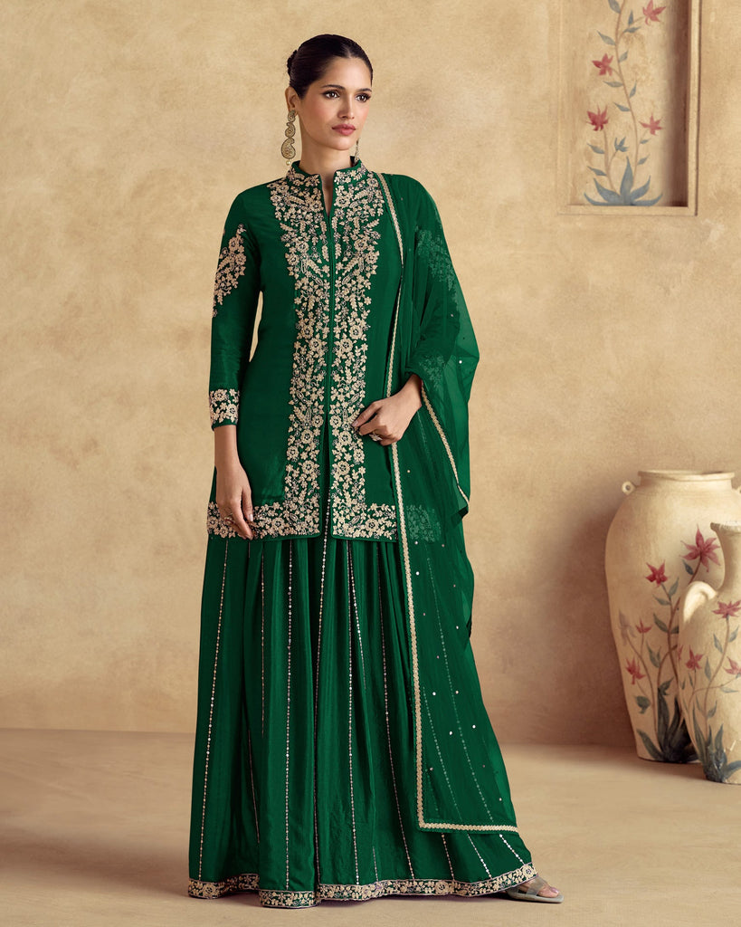 Chinnon Silk Green Thread Stone Work Women Readymade Short Kurta With Palazzo Suit