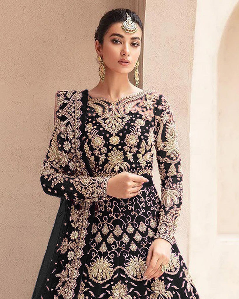 Black Zari & Diamond Work Women Unstitched Anarkali Wedding Gown