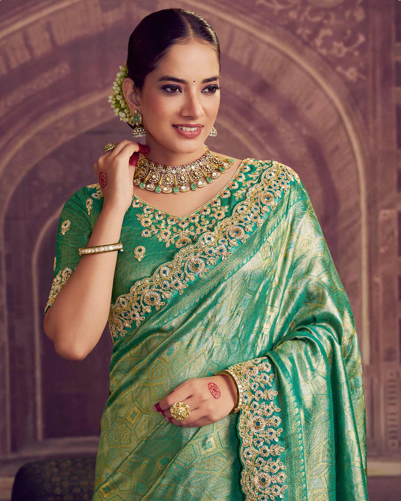 Rama Green Kanjivaram Silk Saree For Women With Embroidered Blouse