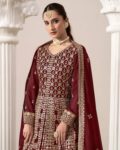 Introducing our luxurious Maroon Faux Georgette Sequins and Zari Work Women Anarkali suit With Dupatta. This stunning Maroon anarkali kameez features heavy sequins and zari work throughout, giving you a truly opulent look paired with matching santoon bottom. The Maroon faux georgette dupatta is adorned with zari and sequins work booties all over with dense work on border length. Elevate your style with this exclusive piece.