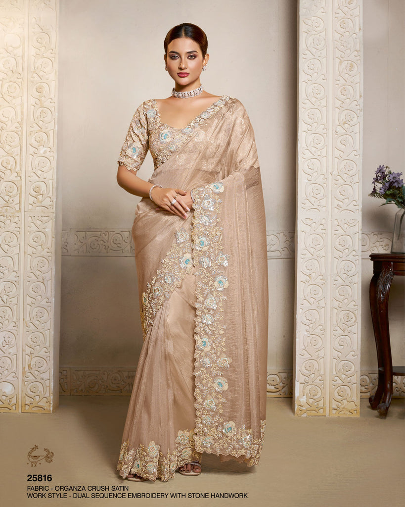 Dusty Peach Organza Crush Satin Silk Embroidery Work Women Saree With Dusty Peach Tissue Silk Embroidered Blouse