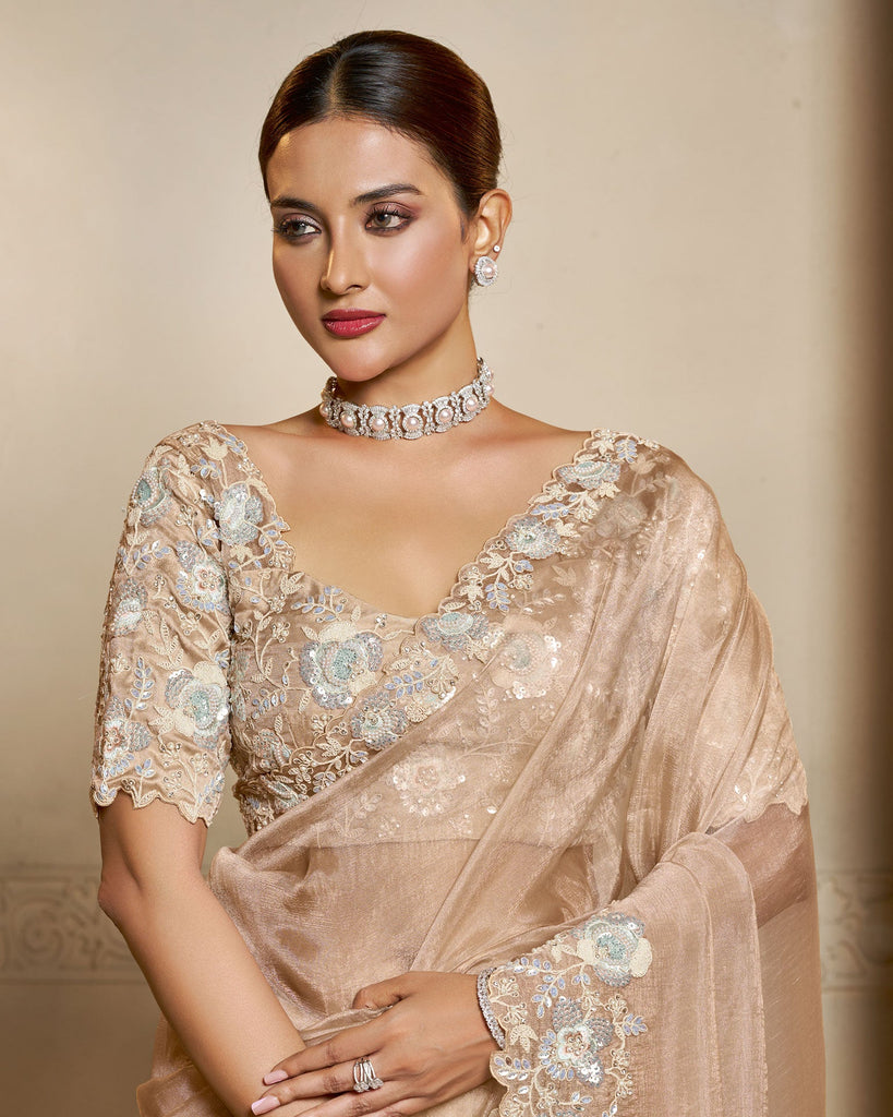 Elevate your ethnic wardrobe with this Dusty Peach Organza Crushed Satin Silk Saree featuring exquisite dual sequins, multi stone with hand work throughout. The rich dual sequins, multi stone work along with hand work embroidery work along the entire border and pallu adds depth and elegance, perfectly complemented by an unstitched dusty peach blouse adorned with intricate embroidery on tissue silk fabric. This ensemble blends delicate craftsmanship with luxurious fabric, ideal for refined occasions where elegance is key.