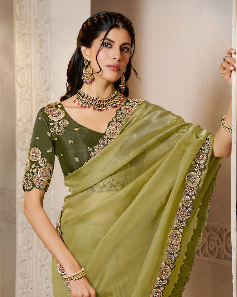 Green Organza Satin Silk Embroidery Work Women Saree With Dark Green Satin Silk Embroidered Blouse