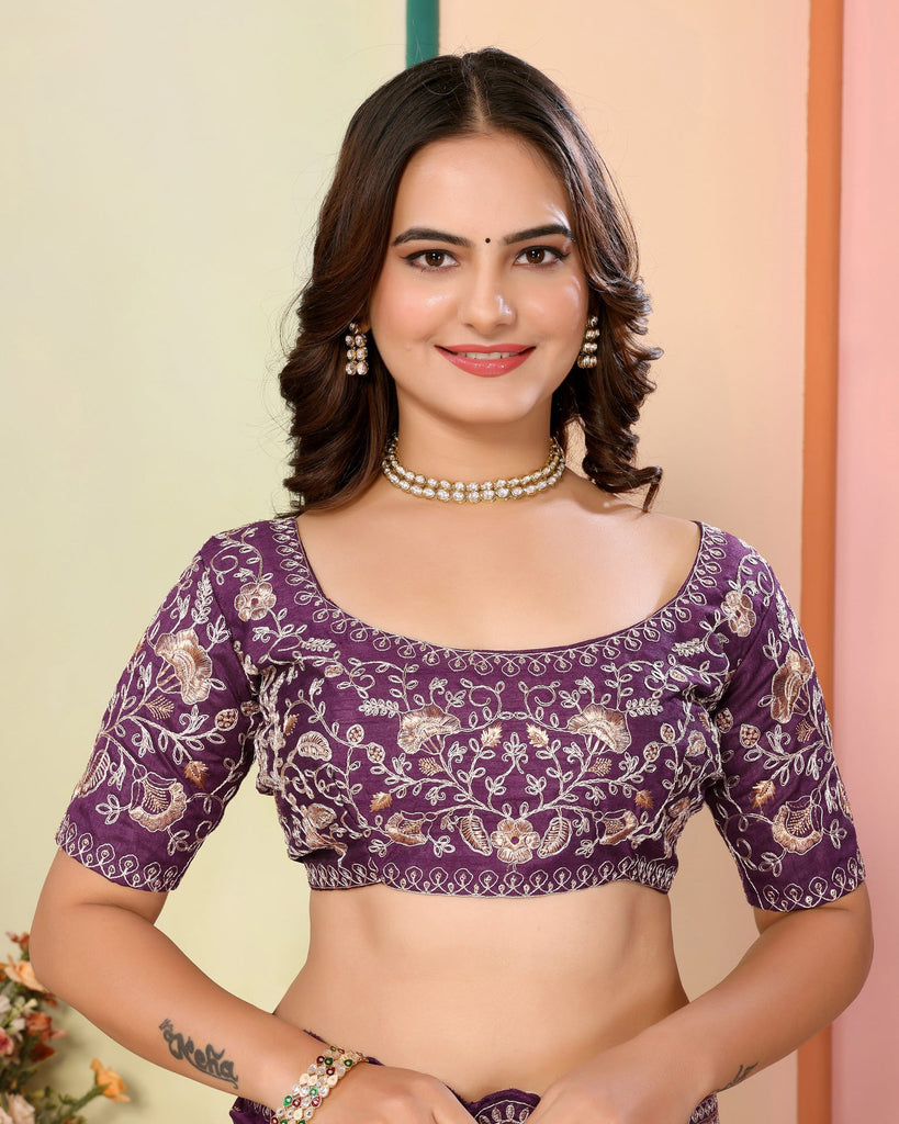 Elevate your ethnic wardrobe with this Wine Organza Saree featuring exquisite thread and sequin work throughout. The rich cutwork pattern along the entire border adds depth and elegance, perfectly complemented by an unstitched art silk blouse adorned with intricate heavy embroidery. This ensemble blends delicate craftsmanship with luxurious fabric, ideal for refined occasions where elegance is key.