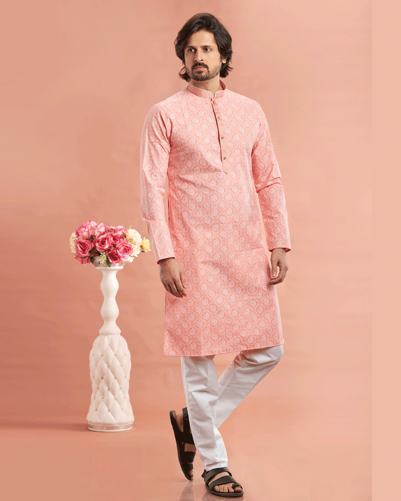 Pink Cotton Digital Print Readymade Kurta Set For Man