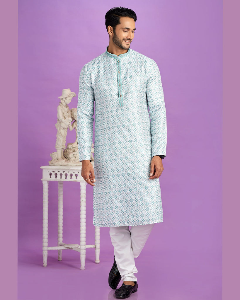 Teal Green color man kurta in semi cotton fabric has digital print all over enhanced with pintuck on neckline paired with off white art silk bottom in churidar style.