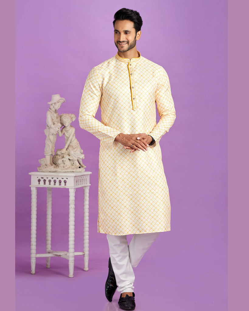 Yellow color man kurta in semi cotton fabric has digital print all over enhanced with pintuck on neckline paired with off white art silk bottom in churidar style.