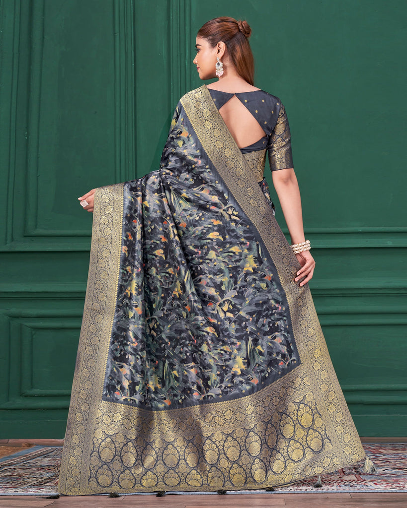 Blue Tussar Silk Jacquard Digital Print Woman Saree with Unstitched Blouse