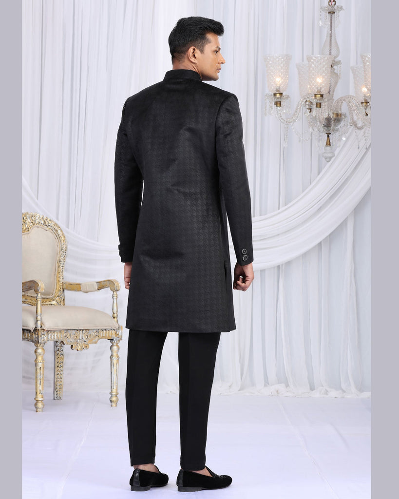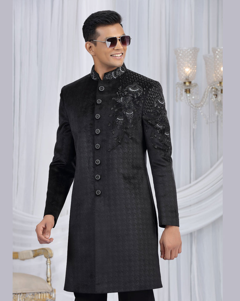Expertly crafted, the Black Embossed Velvet Groom Wedding Sherwani exudes elegance and sophistication. The standing collar and thread, sequence work on the top add understated luxury. The embroidery on the collar and buttons adds a personalized touch. Complete the look with the black dupion silk bottom. Perfect for any man's special day.