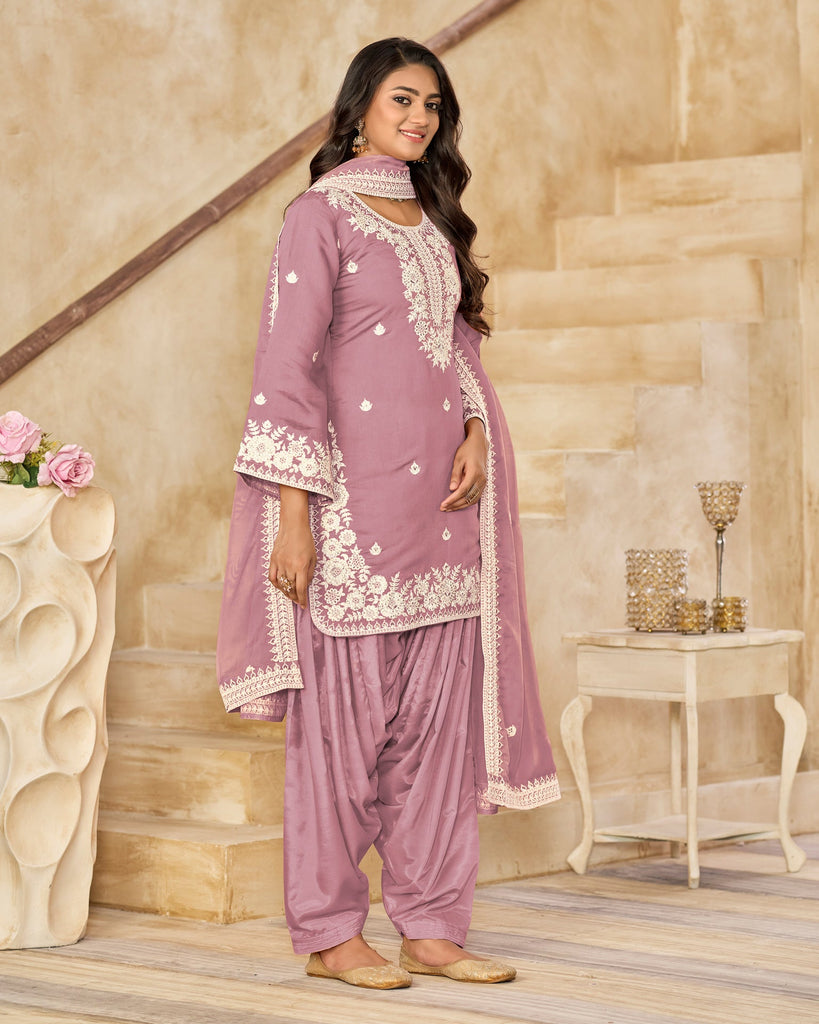 Pink Roman Silk Embroidered Women Unstitched Patiala Salwar Kameez